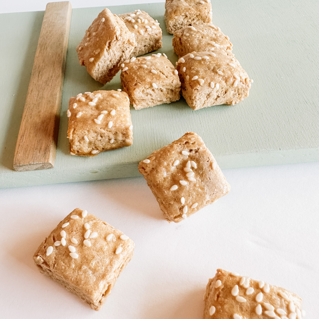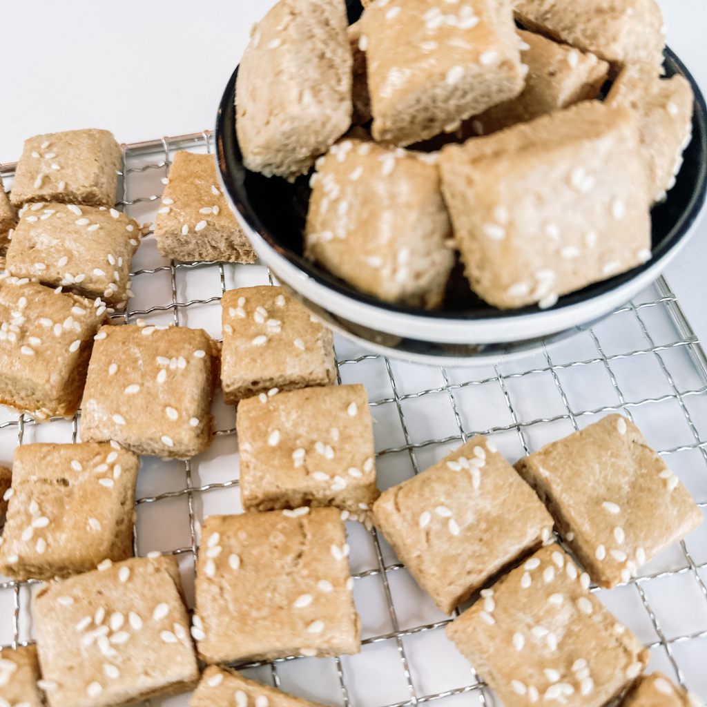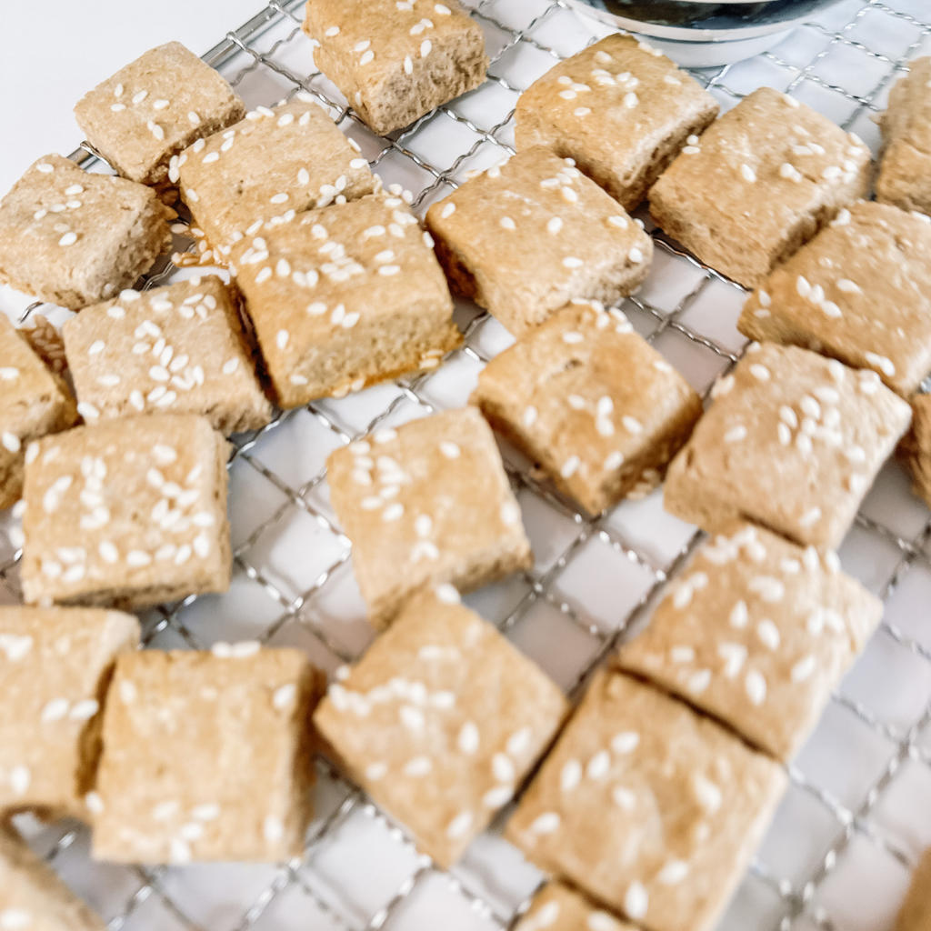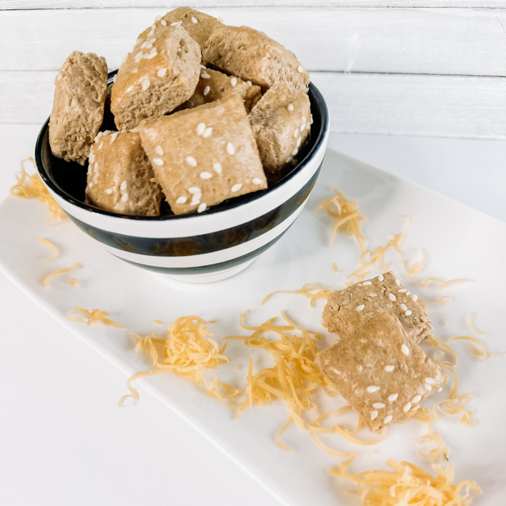 Our Cheese Bacon Pretzel Bites are the ultimate savory snack for dogs who love bold flavor. Baked in small batches with parmesan, cheddar, bone broth, and a hint of bacon, these pretzel-shaped bites bring a fun twist to treat time.
