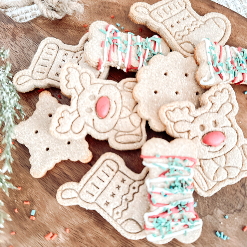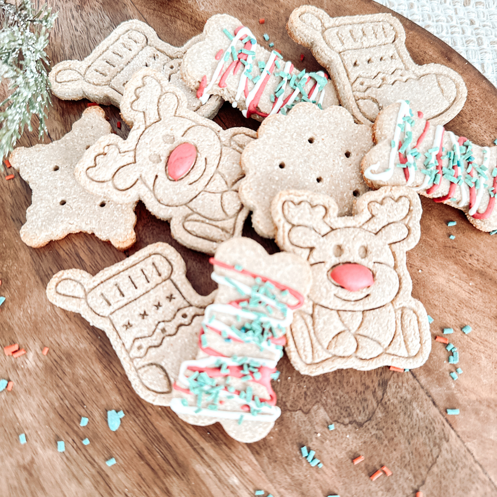 This festive assortment features 10 holiday-shaped treats (reindeer, stockings, bows, stars, and more!) — all soft-baked in small batches with a gentle coconut & banana flavor pups love.